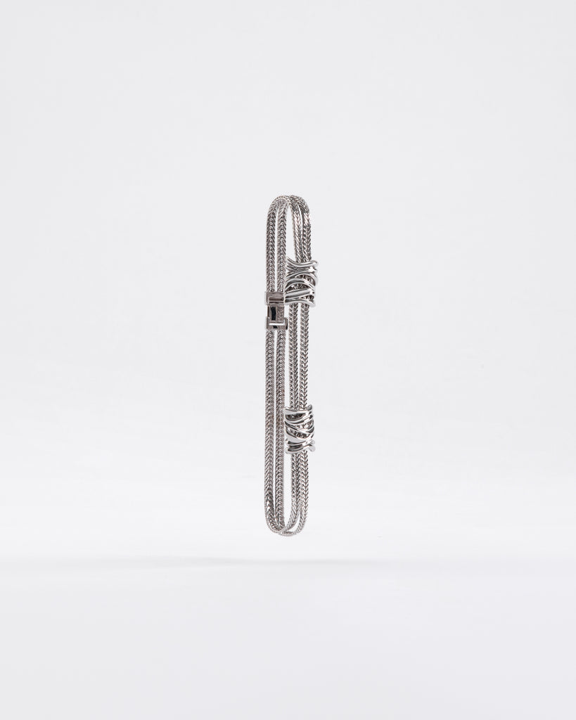 The Dance Loop Necklace continues the “Rhythmic Loops” motif, alternating polished silver loops and chain links. The central twisted loop is artfully refined to evoke musical notes dancing along your neckline. Bold chain links on one side contrast with delicate loops on the other. A five-position extender offers styling versatility—from a close-fit choker to a relaxed mid-length drape.