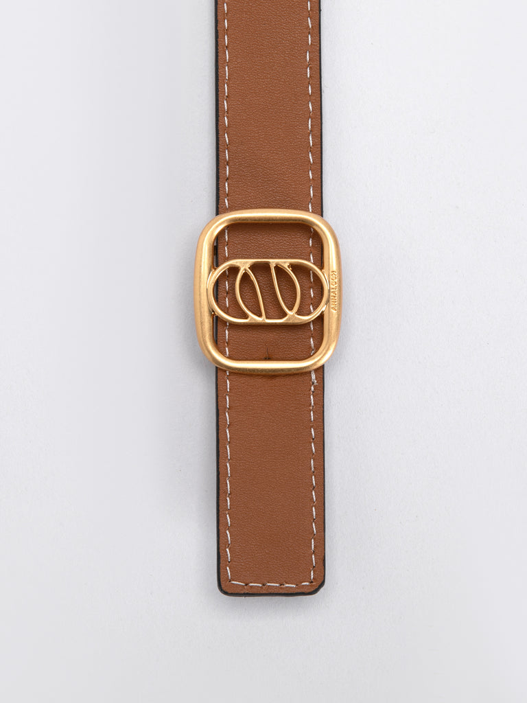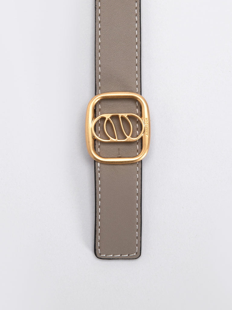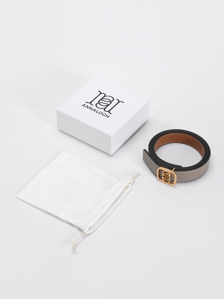 Round-Buckle Double-sided belt in smooth calfskin with a gold round-buckle. 2.5 cm width, adjustable in 5 steps