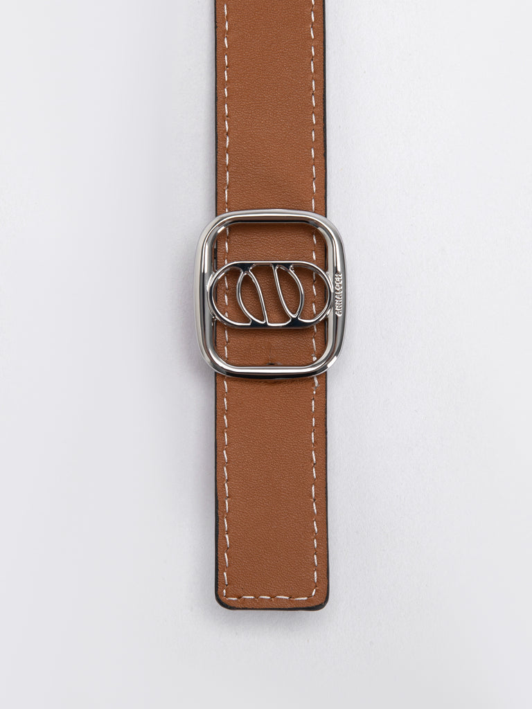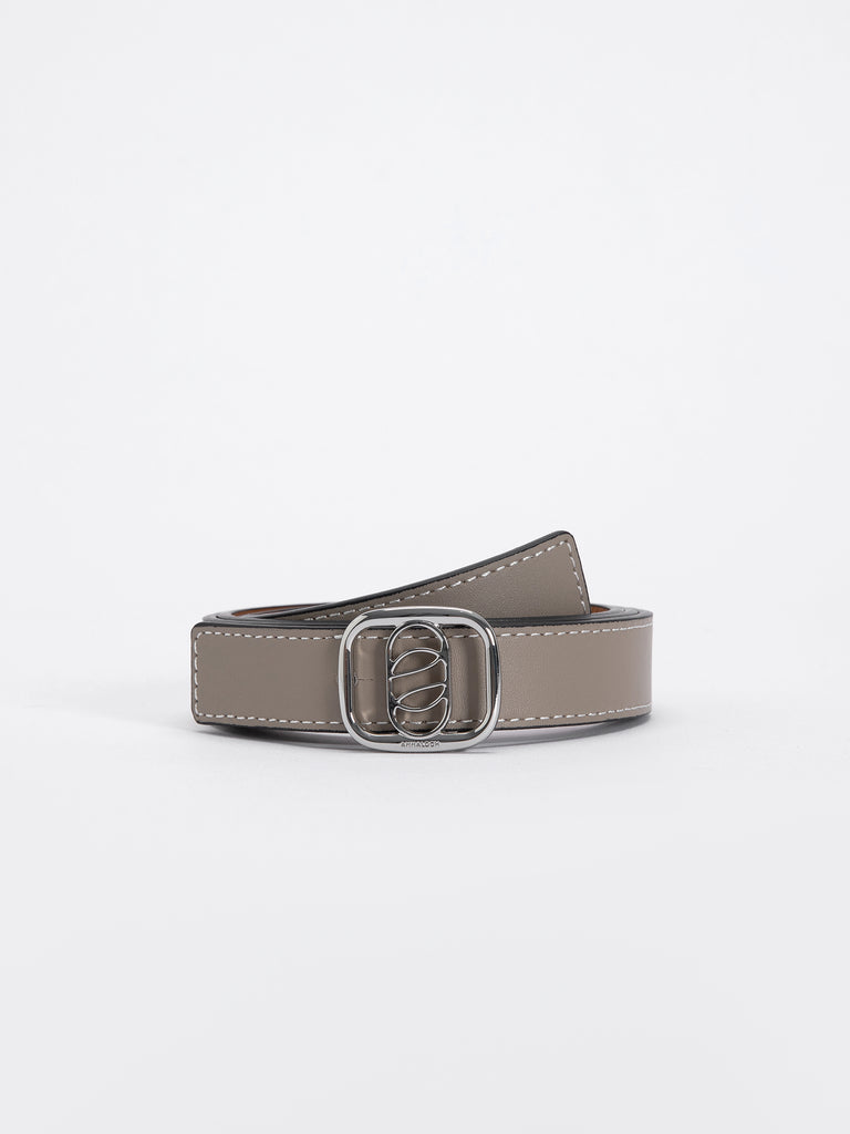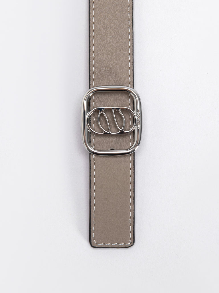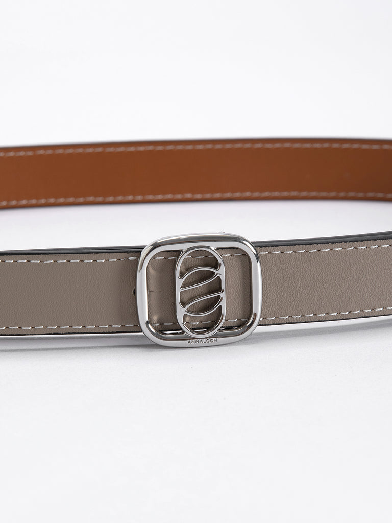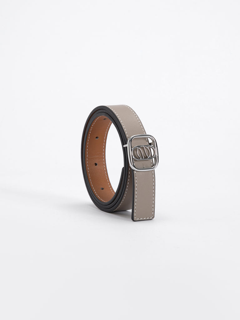 Round-Buckle Double-sided belt in smooth Dove/Tan calfskin with a silver round-buckle. 2.5 cm width, adjustable in 5 steps